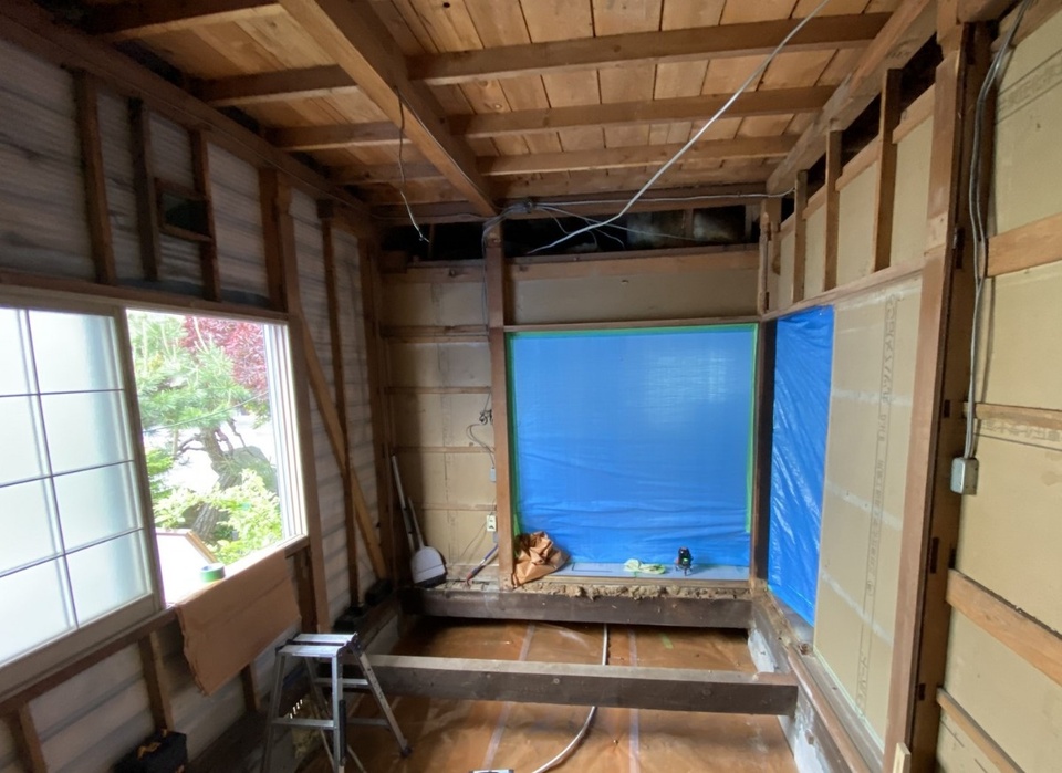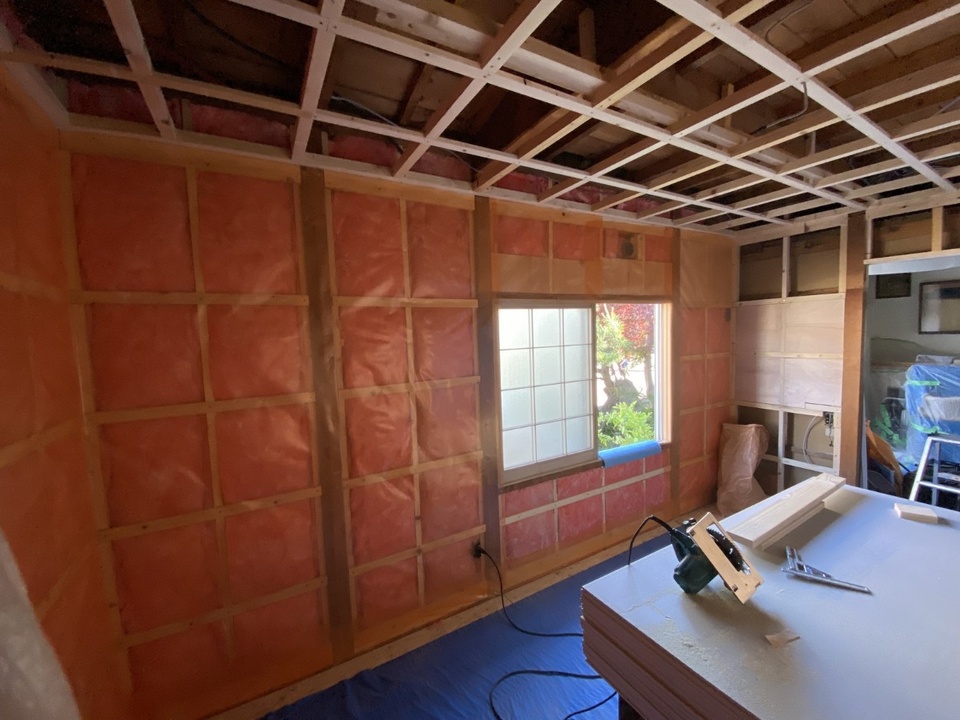 リフォームの目的の1つでもあった断熱対策は、1階の和室に限定し、構造部分から行いました。床、壁、天井をすべて撤去。床下にはF P板3 0ミリ + G W200ミリ、外壁側の壁にはグラスウール105ミリ、天井の小屋裏は一部断熱材が入っていない部分もあったためブローイングを入れました。