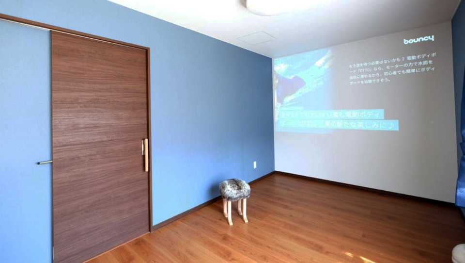 天井にあるのは、プロジェクター機能を備えた照明です。正面のクロスは映像が投影できるよう、目地の細かいものを採用。パソコンの画面も映せて、テレワークに活躍します。