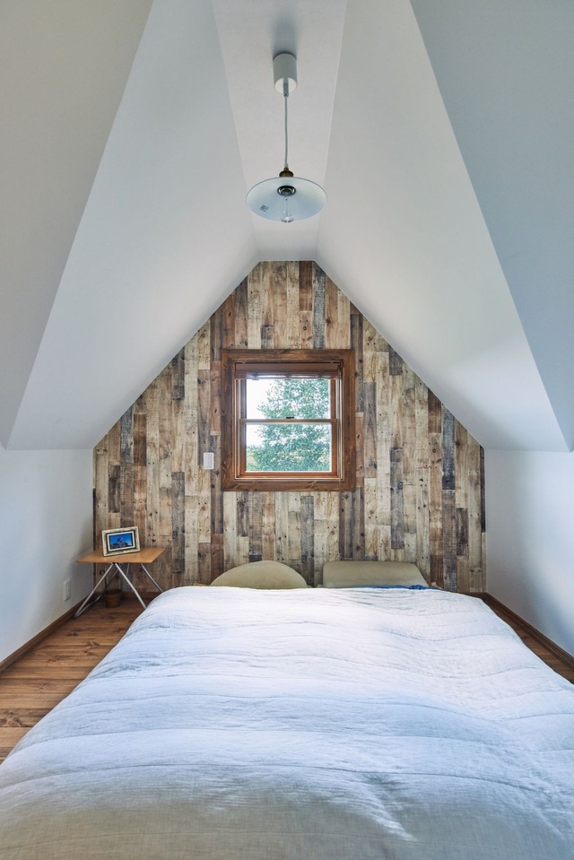 二階の主寝室は屋根の傾斜を活かした天井。落ち着いて眠れるシンプルな空間になっていました。