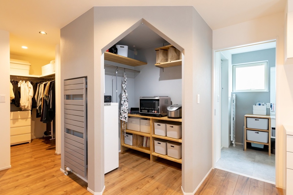三角の下がり壁が付いたパントリーには、キッチン家電や冷凍庫を収めています。「キッチンの背面カウンターには物を置かず、生活感が出ないようにしたかった」とご主人。左手に兄弟用のオープンクローゼット、右手にユーティリティーが見えます。