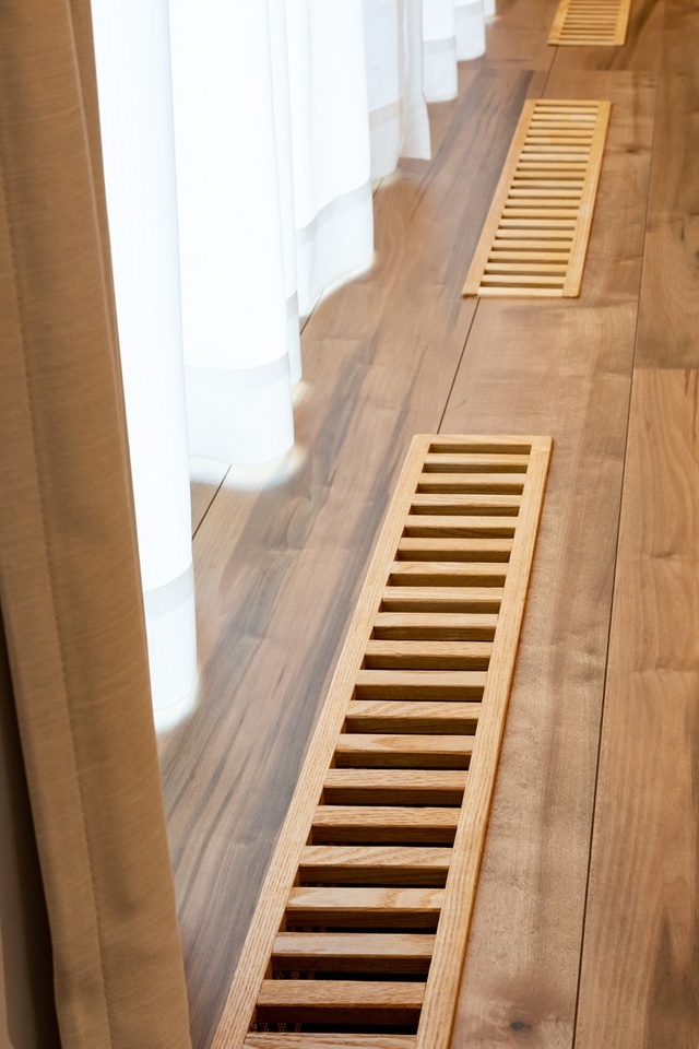 寒い季節には床下に設置されたヒーターのの輻射熱が床ガラリを通って上昇し、足元から暖かく、室内を快適な温度に保ちます。