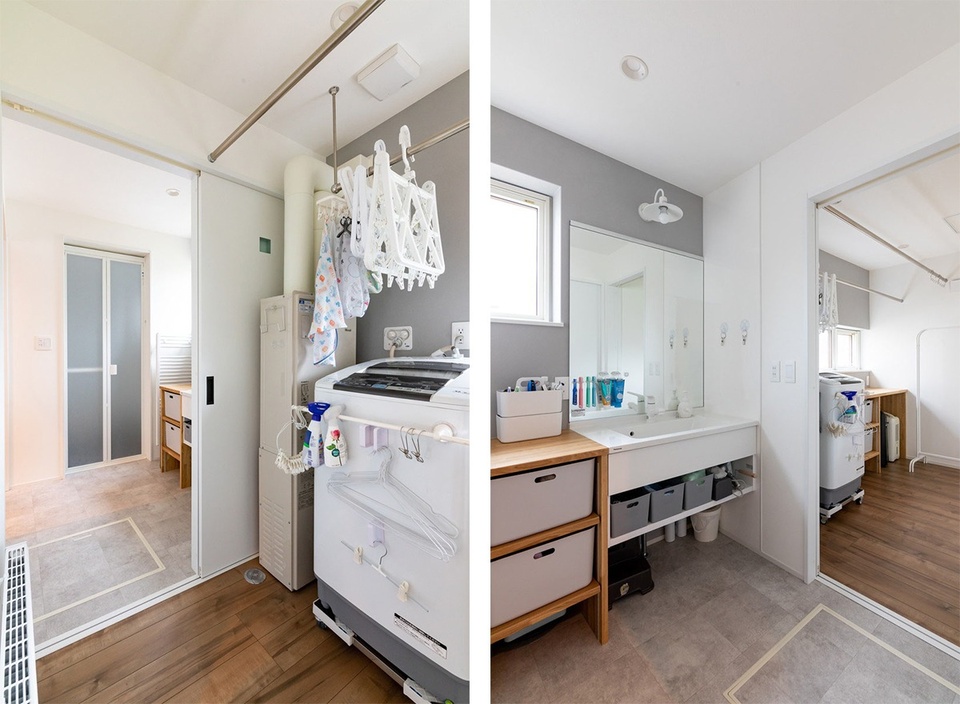 キッチンからの回遊でつながる水回りは、洗濯室側とユーティリティ側の2箇所から出入りできるのがポイントです。