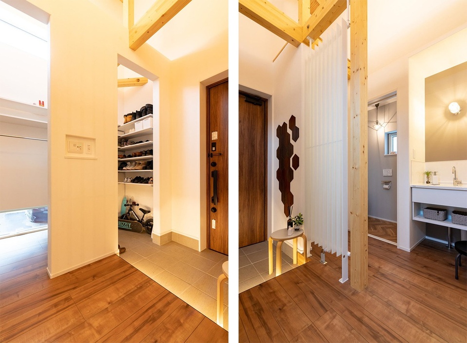 明るい光が差し込む玄関土間には、広いシューズクローゼットを確保しました。