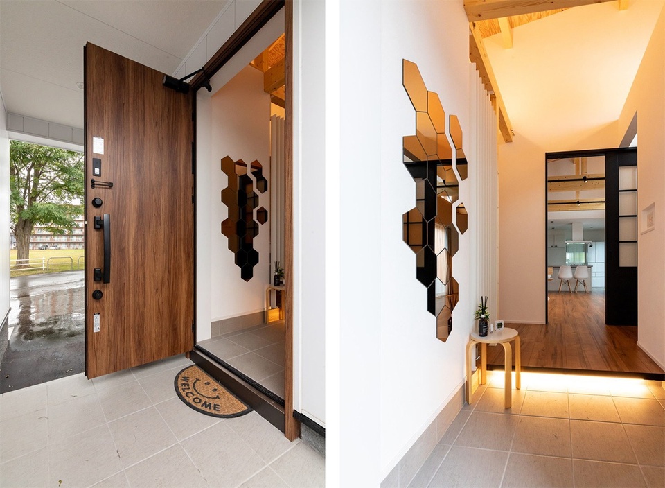 まず入口には、雨でも濡れないようにと屋根付きのポーチを設置。玄関は吹き抜けで、抜群の開放感があります。