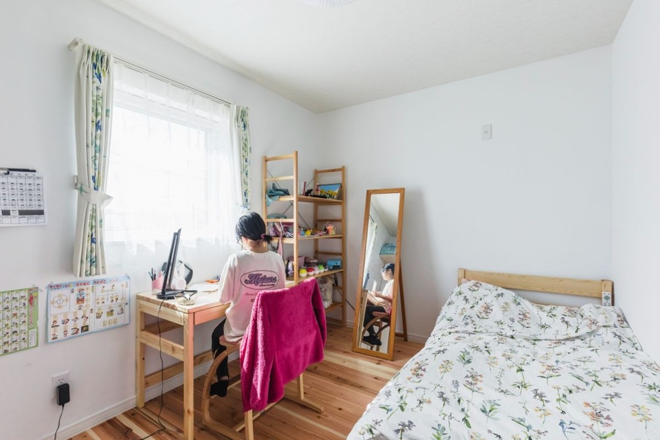2階のフローリングはすべてSさんの発注した杉材を使用。子ども部屋の壁はローラーで塗りました。