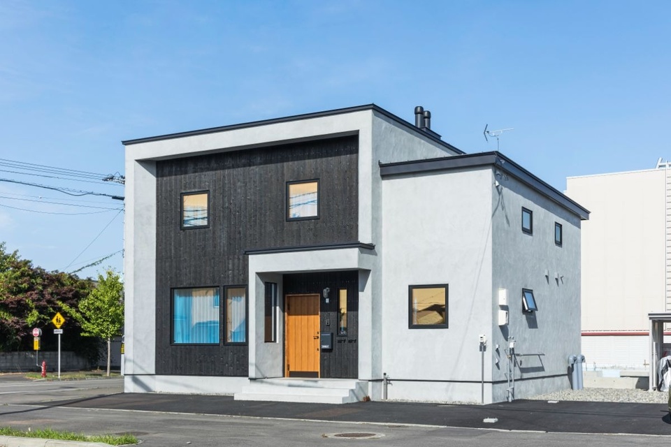設計・施工は帯広のイゼンホーム(株式会社伊善建設住宅部)。外観は四角いフォルムに焼き杉をあしらい、意匠性をプラスしました。塗り壁の色はグレーを選択、モルタル風に仕上げています。