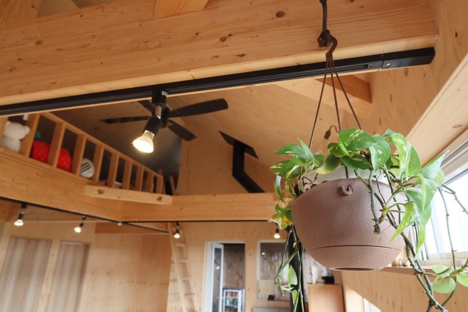 夫婦ともにアウトドアが好きで、「ロッジのような家に住みたいね」なんて話をしていました。今回の家づくりでは、自分たちで梁を足したり、辻野建設工業さんに照明の種類を教えてもらったりなど、自作のインテリアも含めてログハウスのような家を目指して試行錯誤しました。