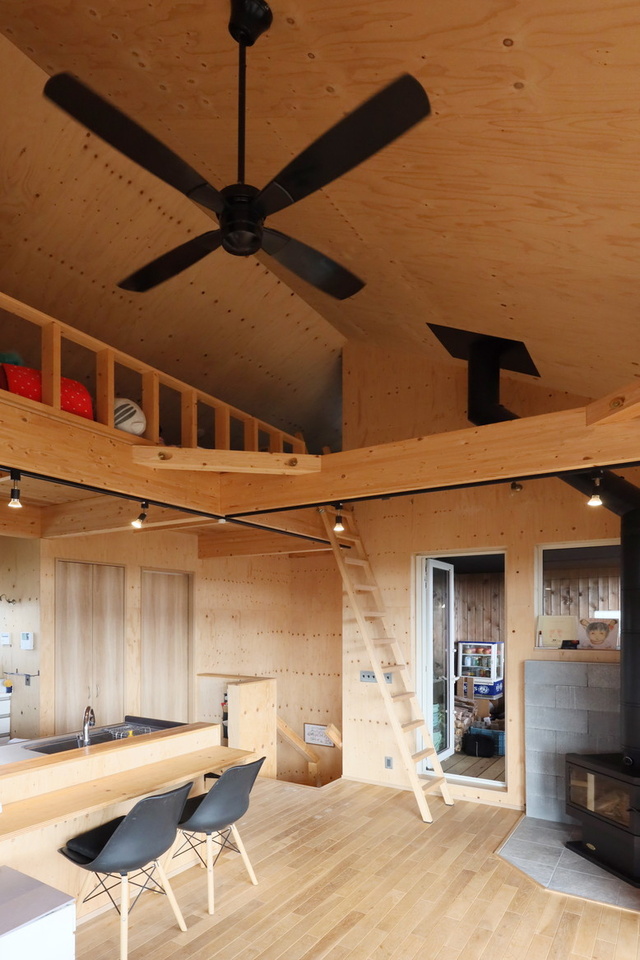 リビングから天井を見上げると、ロフトが目に入ります。当初は吹き抜けの天井となる予定でしたが、大工さんにロフトの作り方を聞きながら、旦那様が自分で梁を足しました。