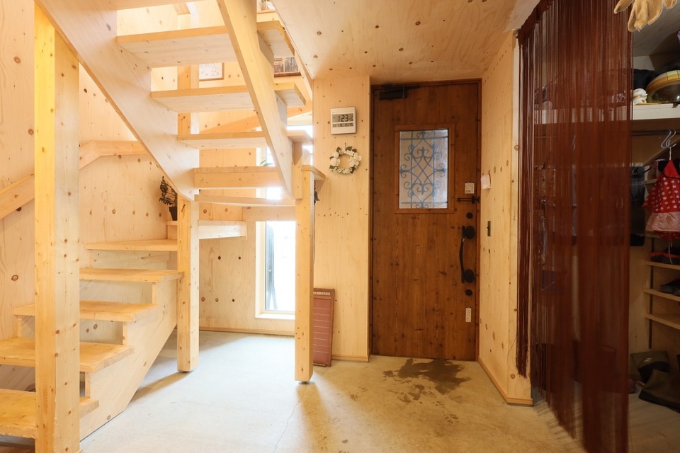 木の温もりが感じられ、光が差し込む明るい玄関。玄関ホールに段差を設けなかったのは「一緒に住む祖父のことを考えて」とのことです。将来的に車椅子が必要になっても、段差がないためスムーズに家の中へ入れます。また、左手のシューズクローゼットには扉がついていませんが、カーテンがかけられ来客からは見えないような工夫も。
