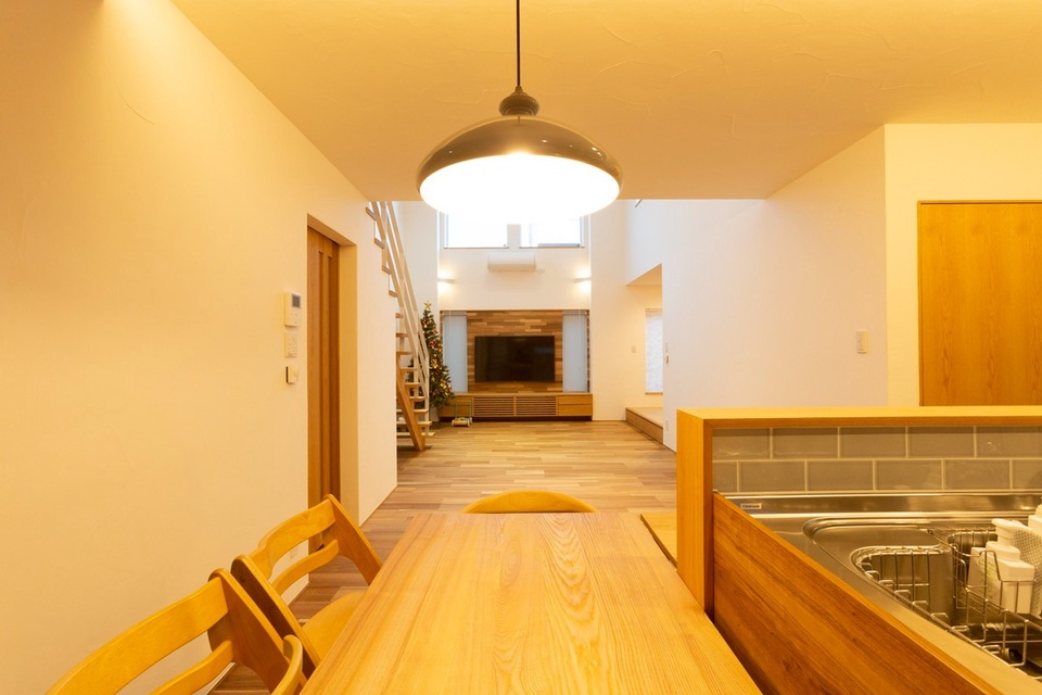 キッチンは正面のカウンターと、4人掛けのダイニングテーブルに囲まれた造りです。カウンターはKさんがお酒を飲むときに座って雰囲気を楽しんでいるそう。今後、おもてなしのスペースとしても大活躍しそうです。