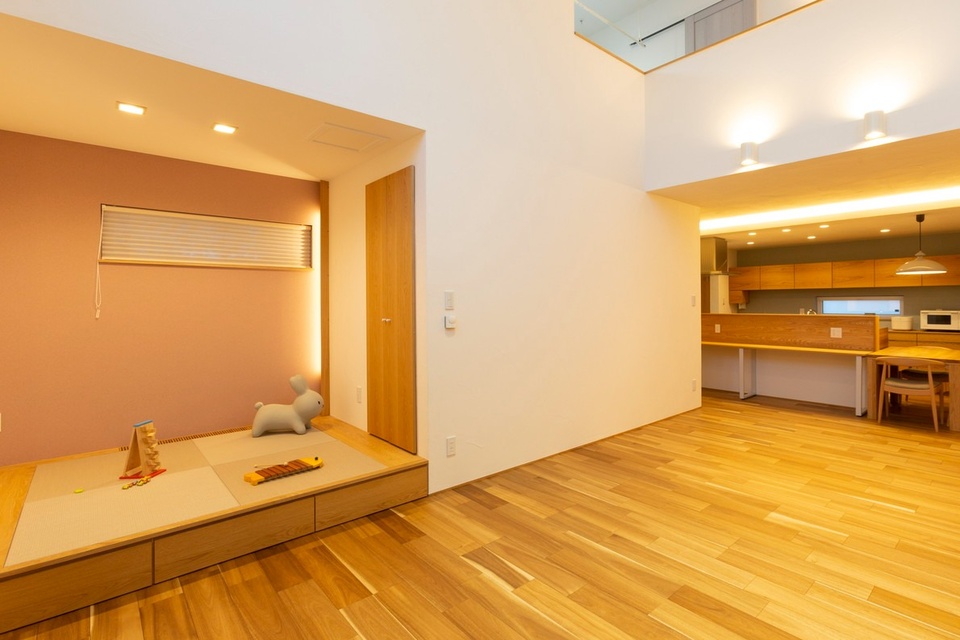 リビング横には小上がり風の畳コーナーも希望しました。桜色の壁紙はお雛様を飾ることを想定して選んだもの。縦位置に配した間接照明が空間に奥行きを与えています。