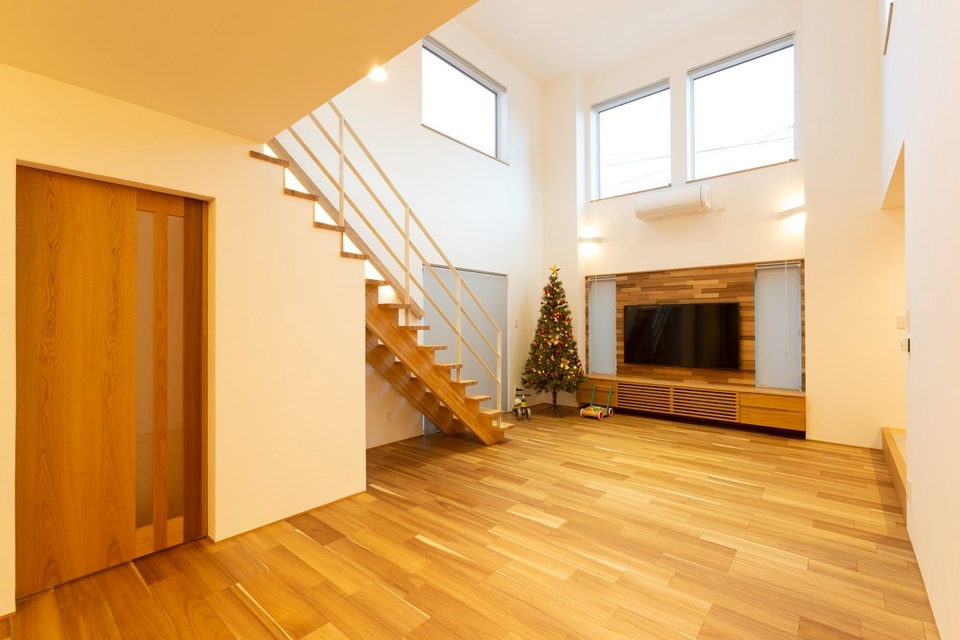 リビングには大きな吹き抜けがあり、高窓から日差しが入る開放的な空間です。床材には天然木を使用した複合フローリング材を採用し、壁は珪藻土の配合された石膏プラスター仕上げ。天然素材の心地よさが室内全体に広がっています。