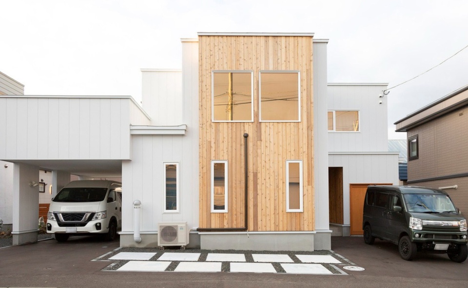 札幌市西区の、川や緑に囲まれた自然豊かな住宅地にKさんのお宅は建っています。外観はホワイトのガルバリウムに明るい木目調のサイディングを使ったシンプルモダンな佇まいです。