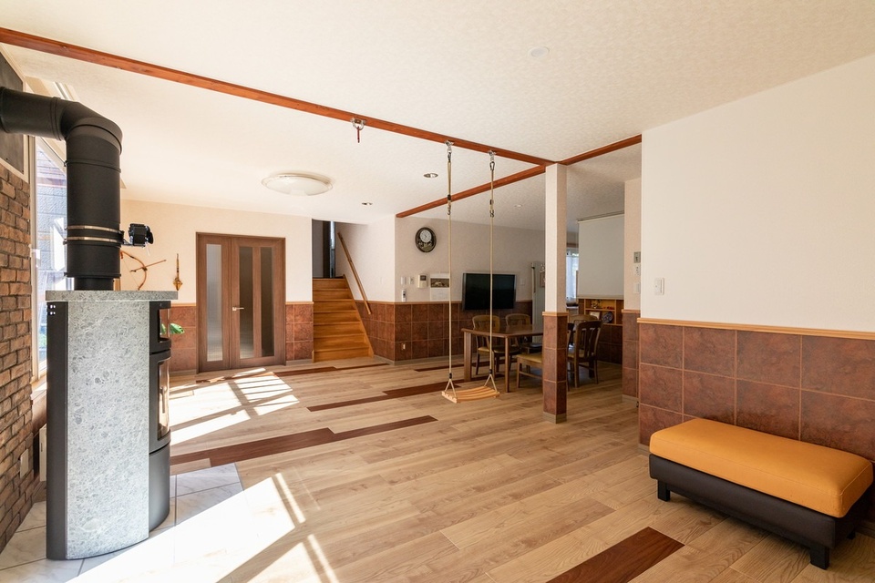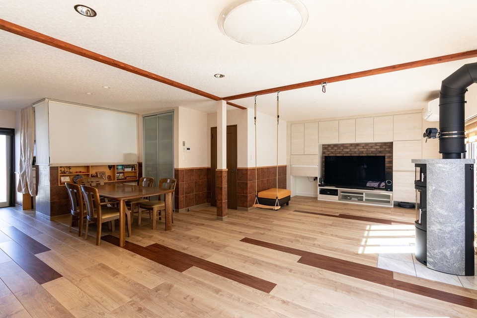 和室を廃し、広々としたリビング・ダイニングにリフォーム。ハンモックを支える梁の強度を高めて、ハンモックとブランコを設置しました。