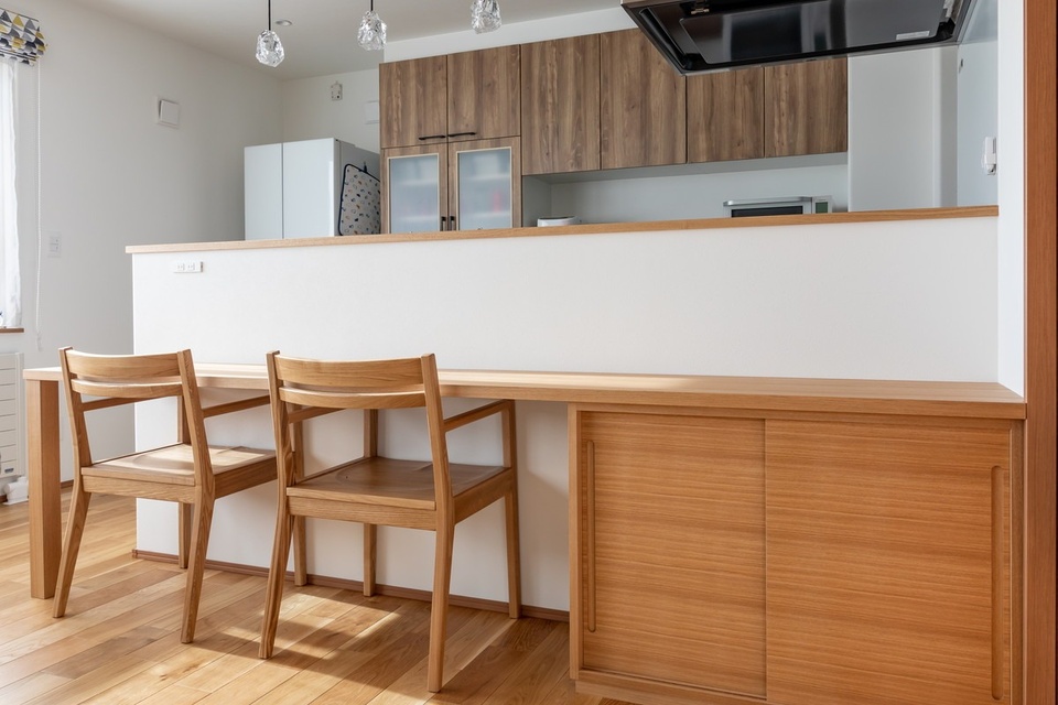 リビングをより広く使うため、ダイニングテーブルの代わりに、収納付きのカウンターを造作しました。