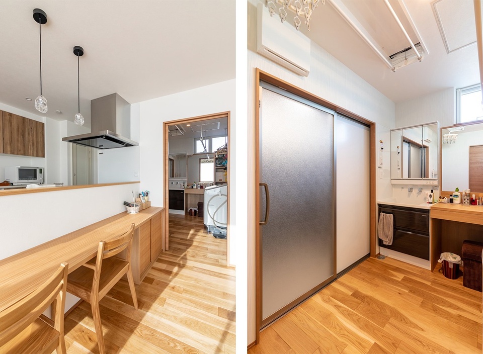 右/手洗いや外出時の身支度など、共働きのご夫婦の生活動線を考え、通路も広めにとりました。ユーティリティーなど、居室以外の場所もゆとりある設計です。