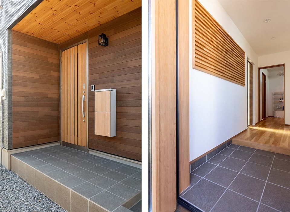 左/外壁は石目調、玄関エントランスは木目調でまとめられたエントランス。共働きのご夫婦は、不在時でも荷物が受け取れるよう、ドアの横に宅配BOXを付けました。