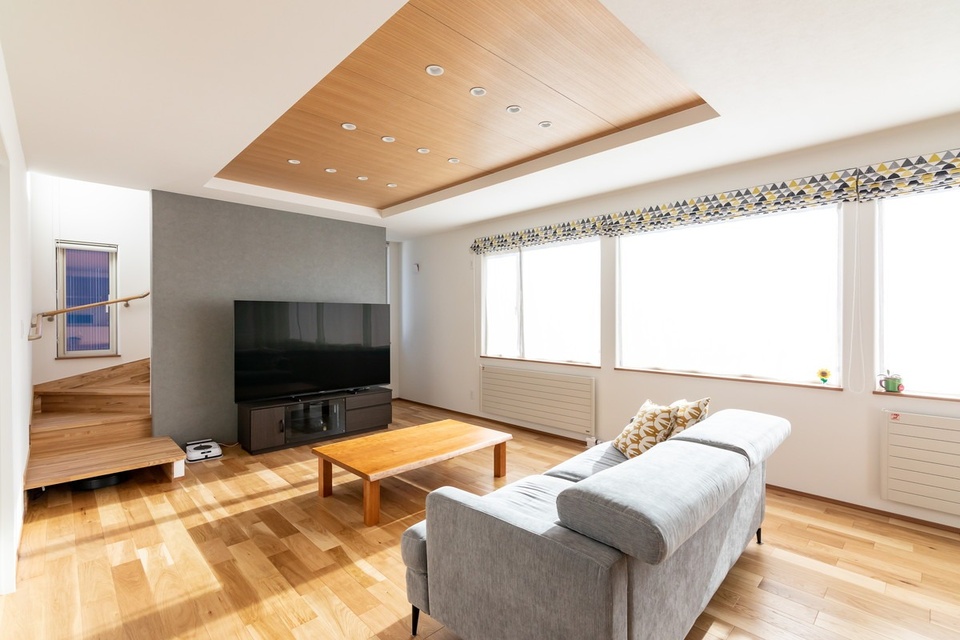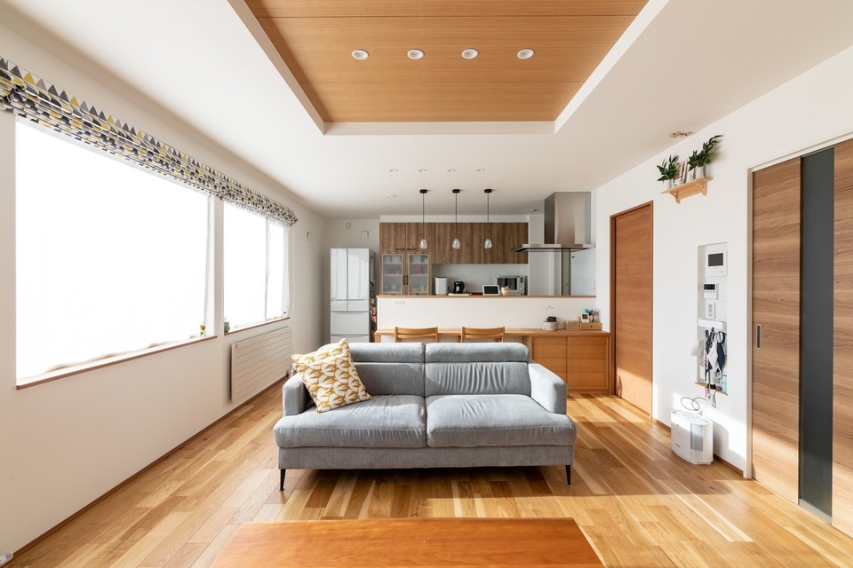 LDKをプランする際に考えたのは、ダイニングテーブルを置かずにリビングスペースを広めに確保することでした。ナラ材の床だけでなく、折り上げ天井にも天然木をあしらうことで、温もりのある空間に仕上がっています。