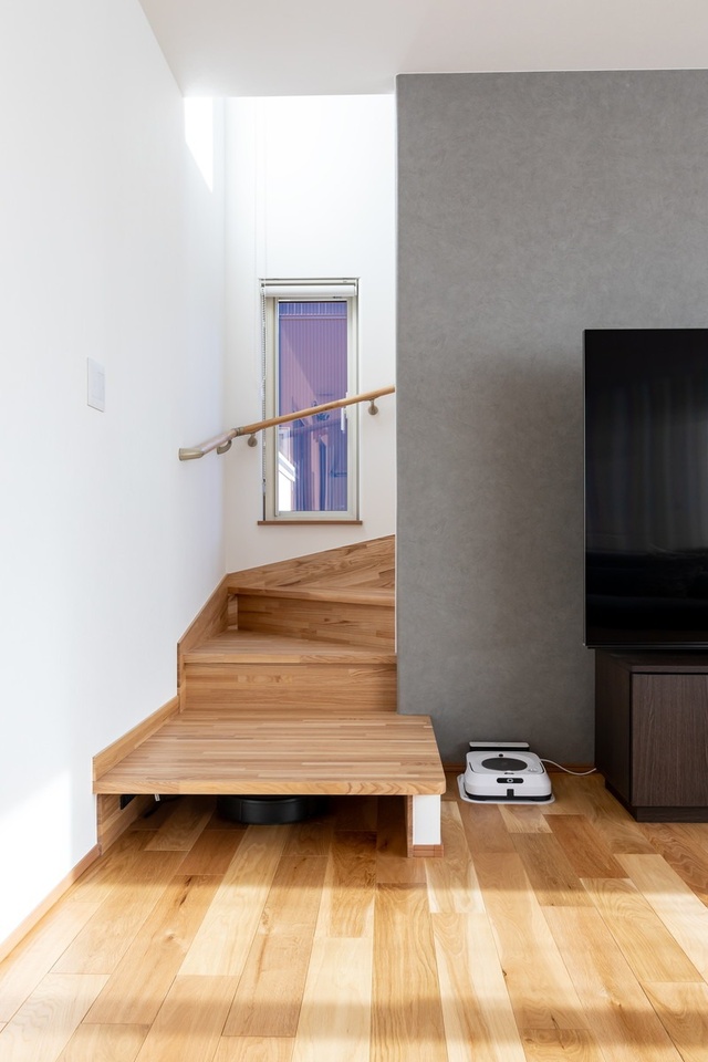 キッチンの対面にあるリビング階段は、将来、家族が増えた時のことを考えた上での設計です。「小さな子どもが腰掛けて本を読んだり、ステージとして使ってくれたらうれしいですね」と教えてくれたのは林さん。ちょっと広めの1段目には、「未来のステージ」という思いが込められていました。