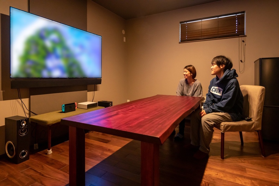 Tさん 「友人たちが集まってはここでカラオケやTVゲームをしたり、夫婦で楽器演奏などを楽しんでいます。音響にもこだわったので、ライブ映像などを観て盛り上がることも多いです」。