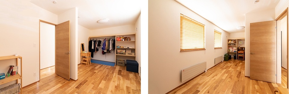 将来に備えた子ども部屋は、間仕切りを付ければふたつの部屋に分けられます。今は、夫婦それぞれの荷物を置くなど、多目的に使っています。