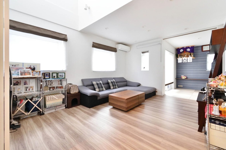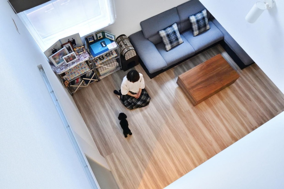奥さまお気に入りの小物が飾られたリビングは、吹き抜けに設けた高窓からの陽射しが心地良い開放的な空間です。