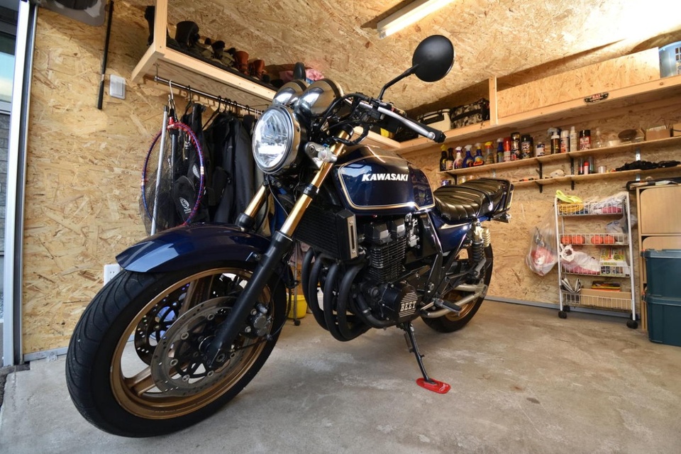 アプローチの脇にはYさんのバイク・KAWASAKI ZRX400が収められたガレージがあります。