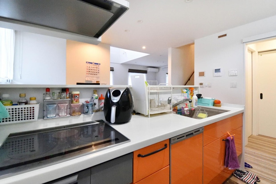 オレンジのキャビネットが可愛いキッチン。リビングから見えるところは飽きの来ない白で統一しています。