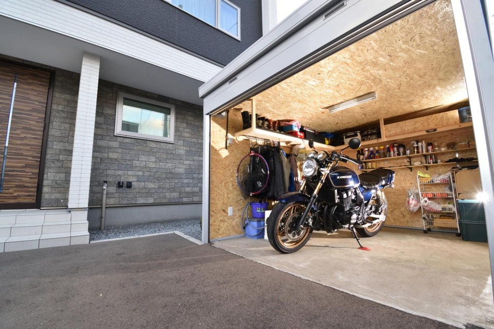 「マンションに住んでいた頃のようにバイクを外置きしたり、ショップに預けたりしたくなかったので中で作業ができるバイク専用のガレージを造りました」とYさん。