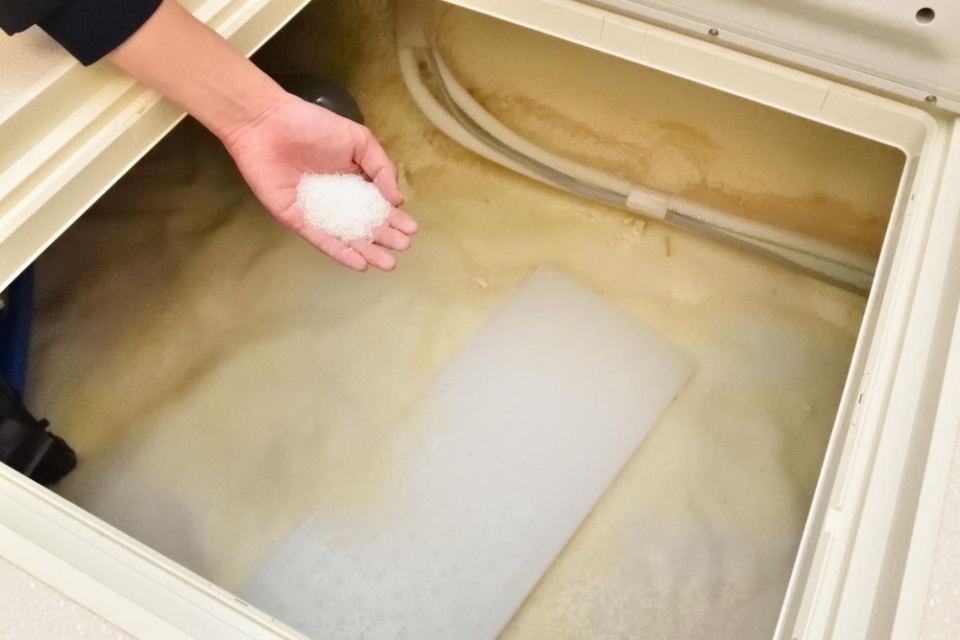 Yさん 基礎断熱した床下空間には、調湿剤(手にとった白い粒子)を散布しています。湿度が60%以上になったら湿気を吸収、40%以下になったら放出し、適切な湿度を保ちます。