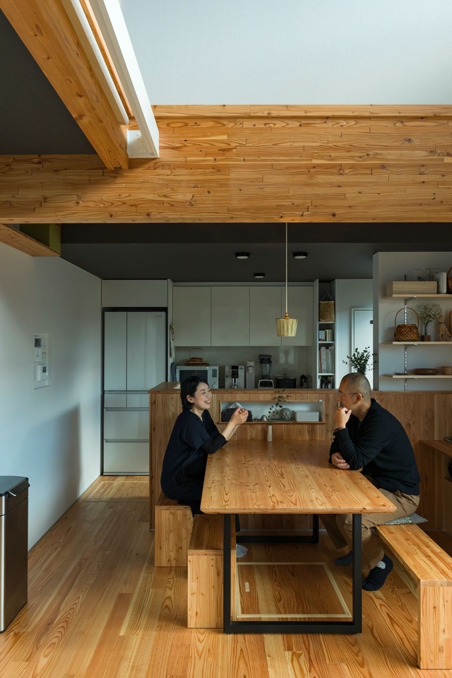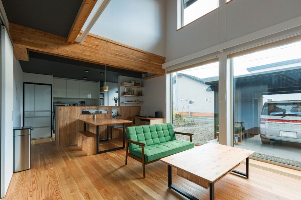 LDKは梁と床だけでなく、キッチンの壁やダイニングセットまで道産のカラマツ材で造作し統一感を出しました。