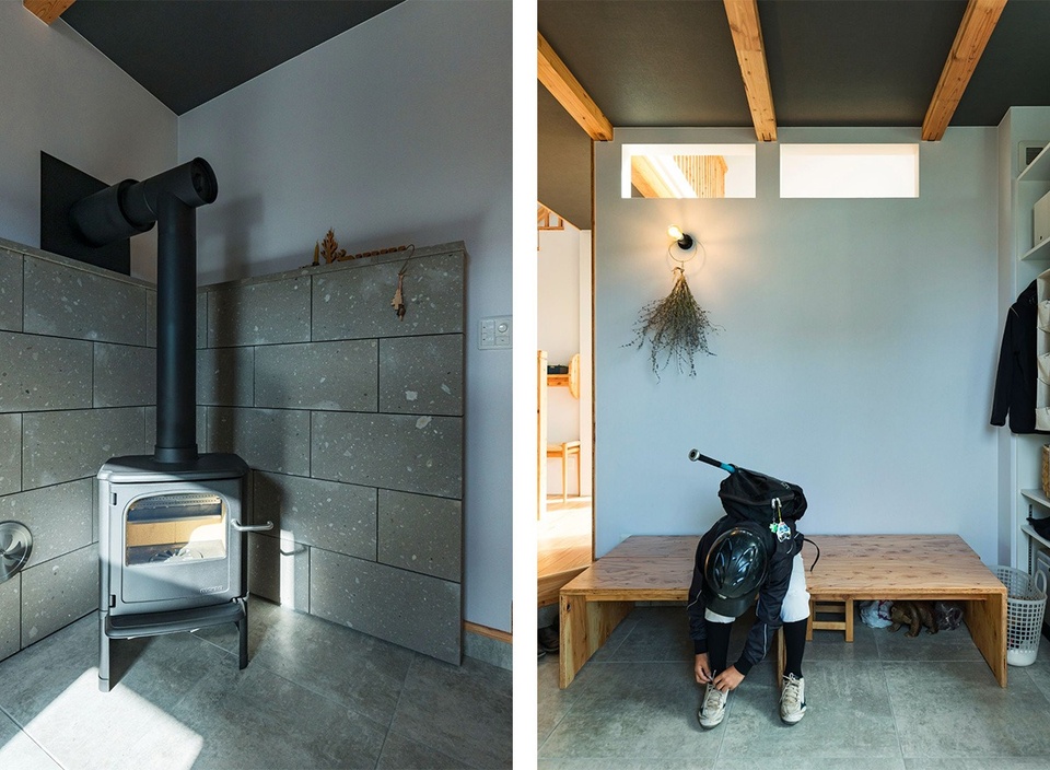玄関は広々とした土間空間。写真左手前には薪ストーブを設置し、玄関という役割を超えたくつろぎの場となっています。