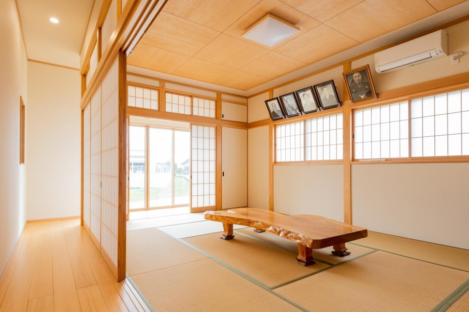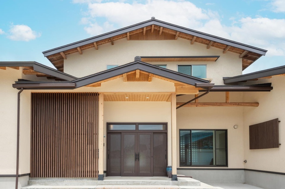 2019年夏に完成したS邸は、家の中心に玄関を構え、堂々とした佇まいの日本家屋です。「風通しと日当たりが良い昔ながらの家にしたかった」とSさん。奥さまも「流行に左右されないから」と、夫婦ともに和風を希望する中、地元密着の村上工務店に依頼しました。