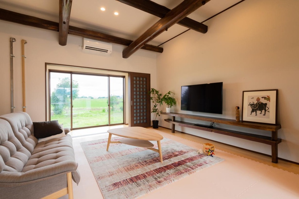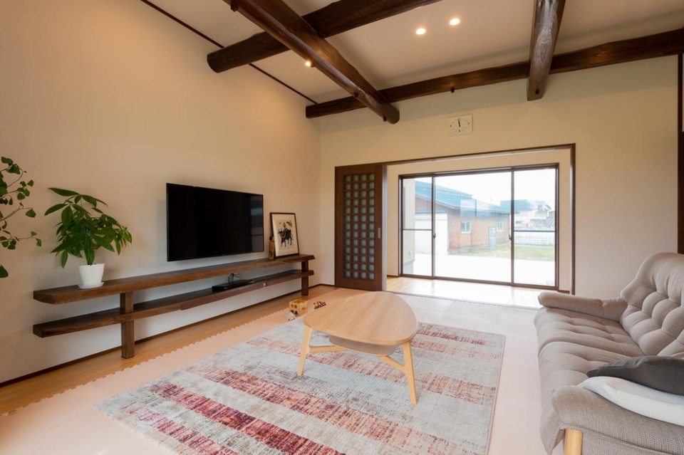 天井には、古材の丸太梁、テレビボードはカツラで造作したものです。引き継がれた歴史を感じる現代和風のリビングです。