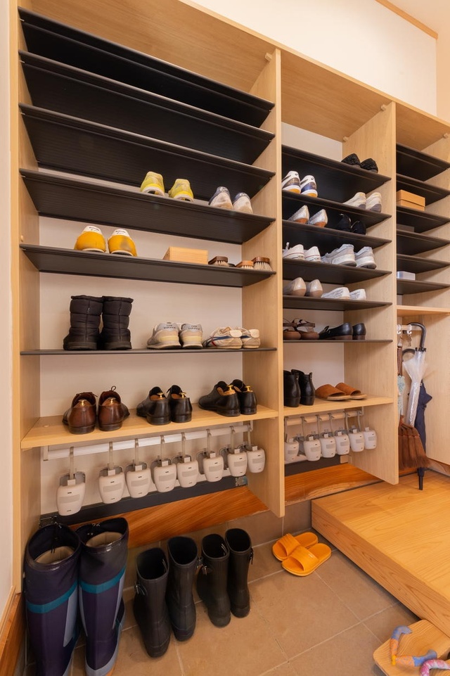 収納力のあるシューズクローク。一部に棚板のない箇所を設けてバーを通し、傘やほうきをかけられるようにしました。お客さまをお迎えする玄関とは別に、Sさん家族はこちらから出入りしています。