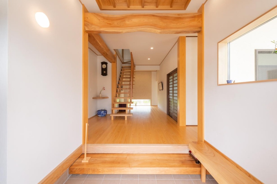 漆喰塗りの壁が木の風合いとマッチした玄関。頭上には自然に婉曲した梁が目に飛び込んできます。