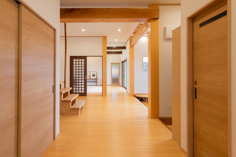 建て替え前の旧居の延床面積はおよそ100坪。新居は70坪ほどになりましたが、「コンパクトな造りではなく、昔の家のようにきちんと廊下がある家」というSさんの希望で、玄関ホールや廊下にゆとりの幅を確保しています。