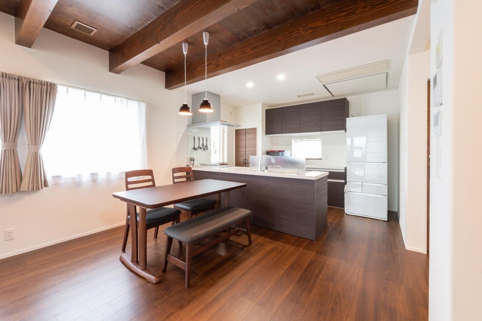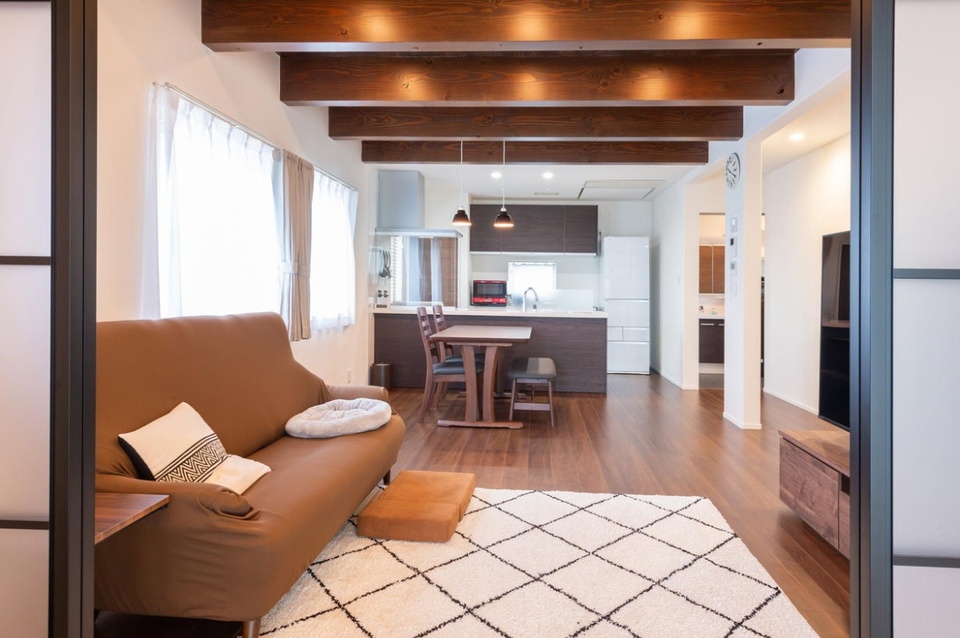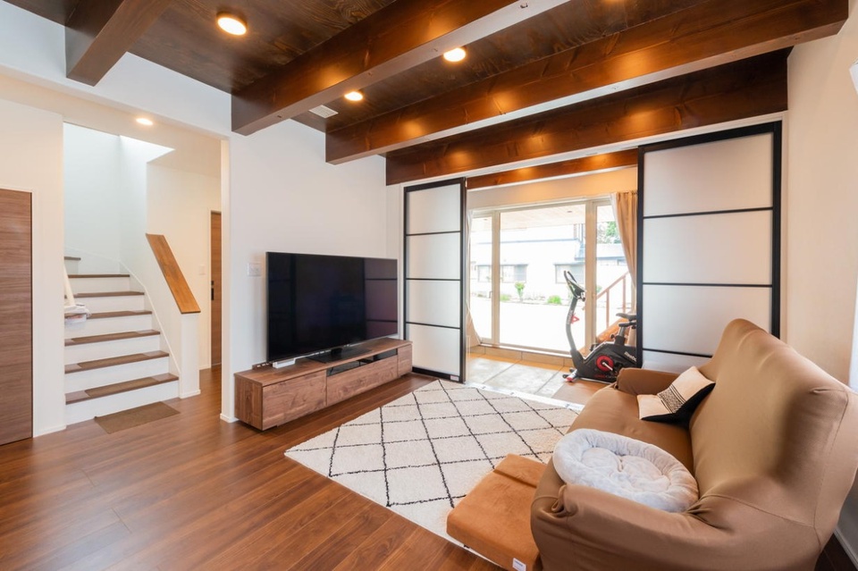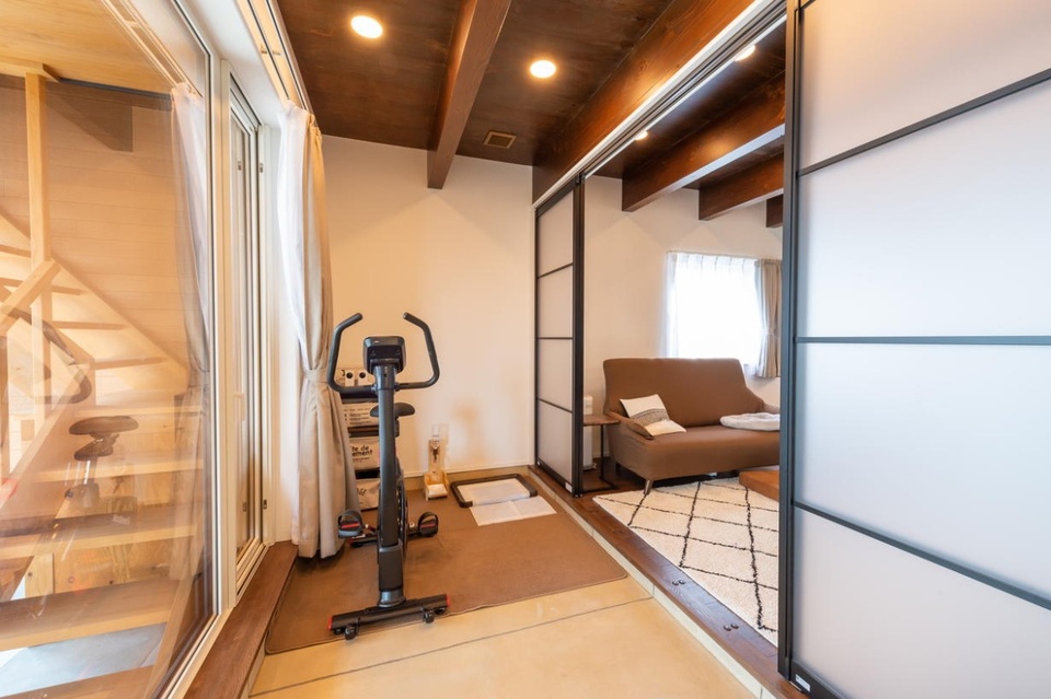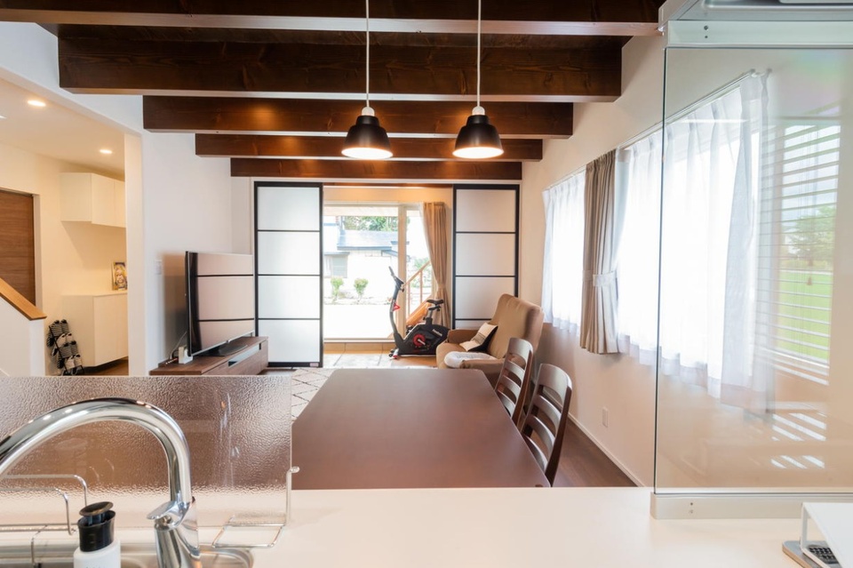 キッチンからはリビングダイニング全体が見渡せます。ふすま風の引き戸の先には土間スペースを設置。リビングと一体で利用できる半屋外空間となっており、愛犬のぽんちゃんのハウスやフィットネスバイクを設置しています。