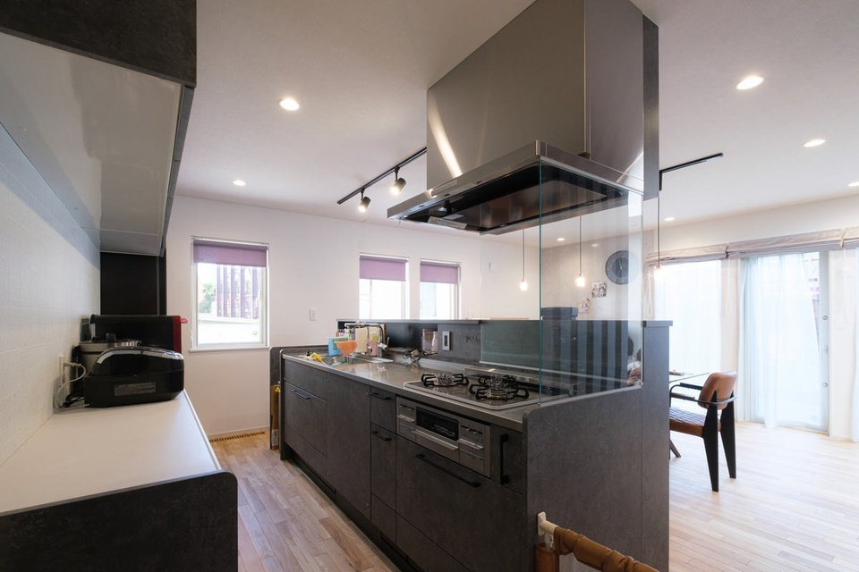 キッチンはダイニング側から手元が見えないよう高めのカウンターを造作。両サイドに通路を造り、回遊動線を確保しました。