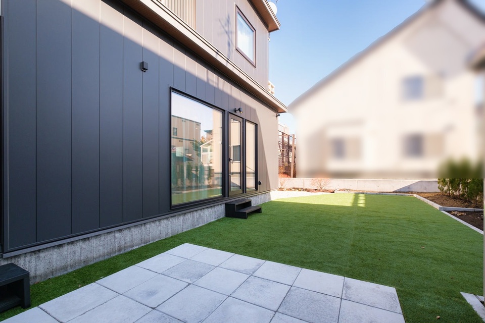通りから見える部分は人工芝。建物裏側は防犯のため歩くと石が擦れ合って音が鳴るようピンクの石を敷き詰めました。