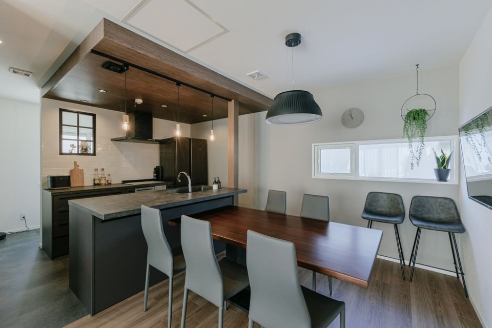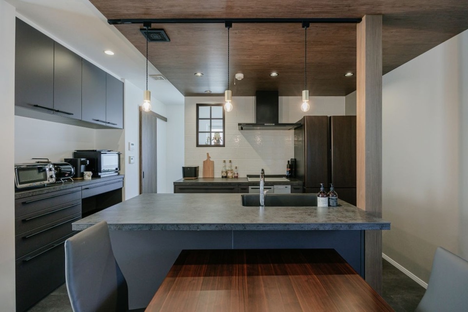 「視線の奥に暗い色を持ってくると空間が広く見えると聞いて」と、天井はダーク系の木目クロスを使った下がり天井に。床には濃い石目のデザインを合わせ、黒いキッチンと一体感のある空間に仕上げました。