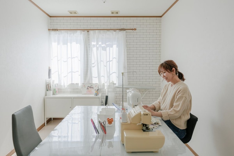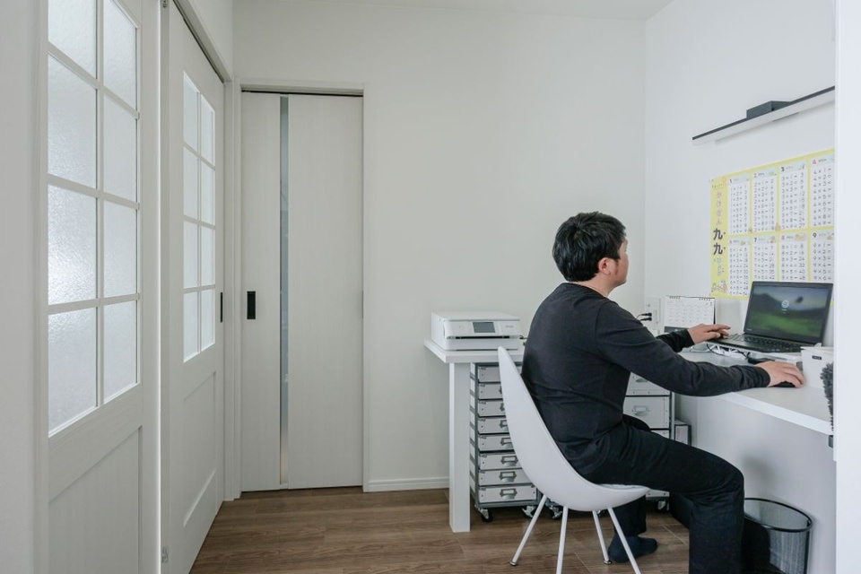 「オンラインミーティングをする時に背景を可愛くしたくて」(奥様)と、背後のドアのデザインにもこだわりました。