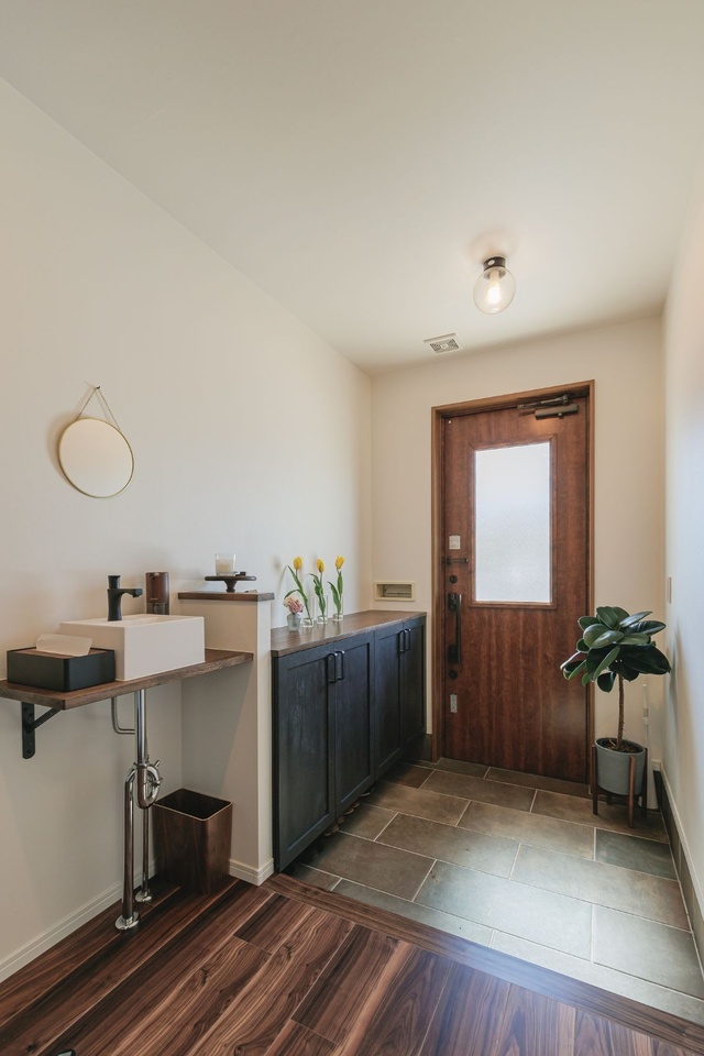 リフォーム後の玄関です。色味が統一されモダンな印象に。ホールに設置した手洗い場もすっきりと空間に溶け込んでいます。