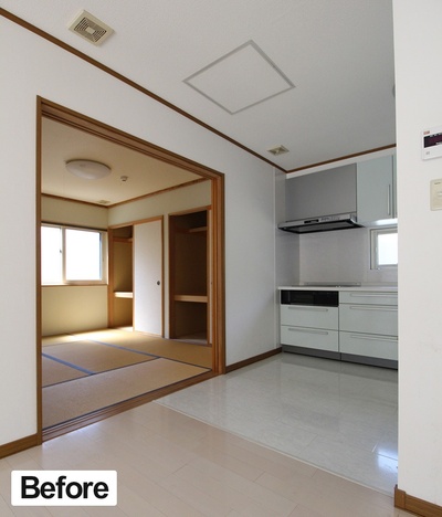 リフォーム前は壁に面していたキッチン。奥の和室との間の壁を取り去ると……