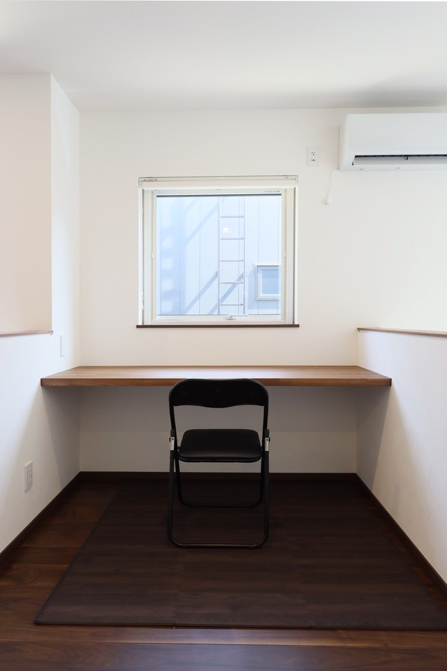 書斎コーナーとしても利用する予定の3畳のフリースペース。窓の下に、奥行60センチ、幅148センチのワイドカウンターを造作。「洗濯物をたたむのに重宝しています」。