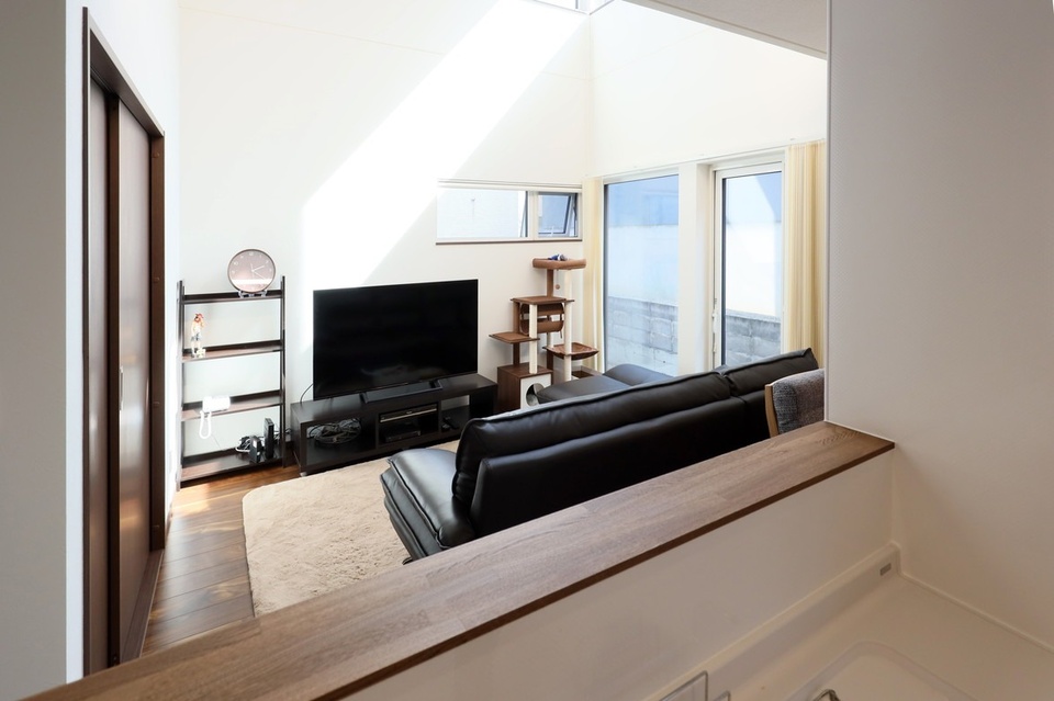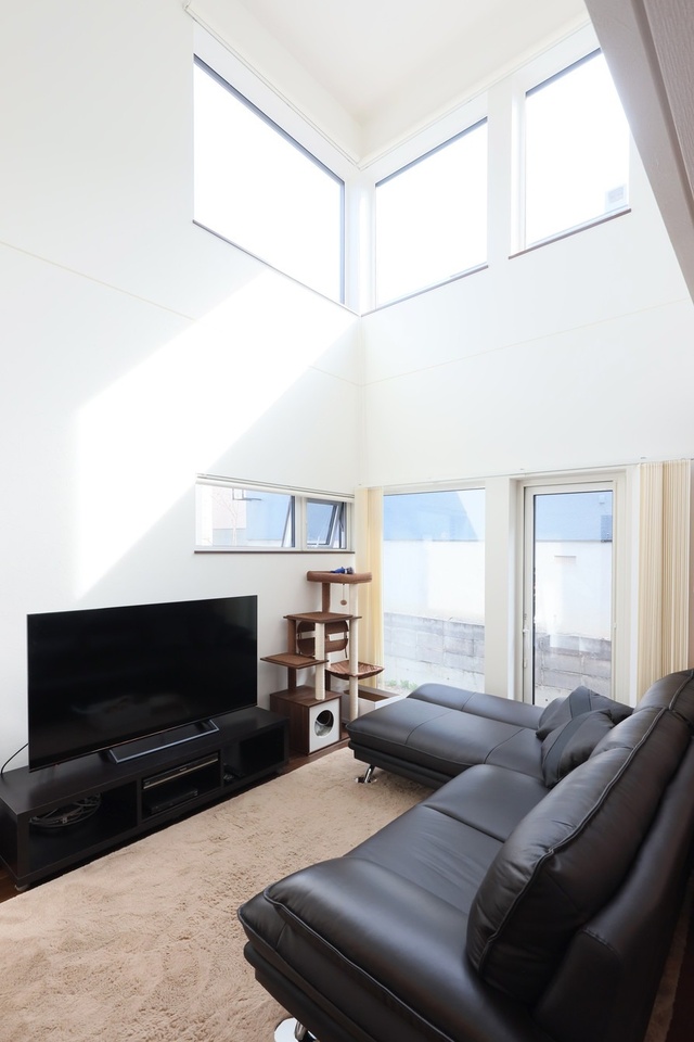 (1)3方向に家が建つ45坪の住宅地という立地に配慮した吹抜けのリビング