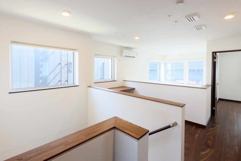 2階のホール全景。フリースペースは壁手すりを採用することで、奥まで視界が広がり、陽光がたっぷりと注ぐ開放感あふれる空間に。