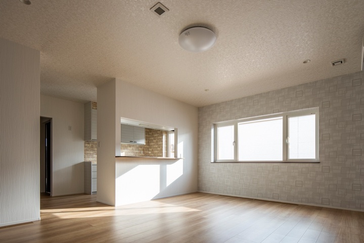 対面キッチンを備えたリビングは、大きな窓から日差しが注ぐ明るい空間です。