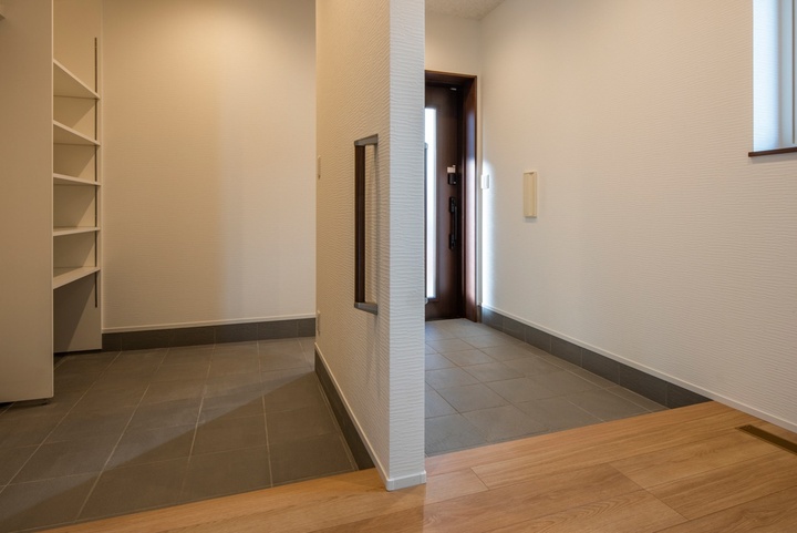 シューズクロークの壁に収納棚を造作した家族用と、来客用にルートを分けた玄関。外出時の上着やランニングが趣味のご主人の靴などは、家庭用玄関に収納しています。