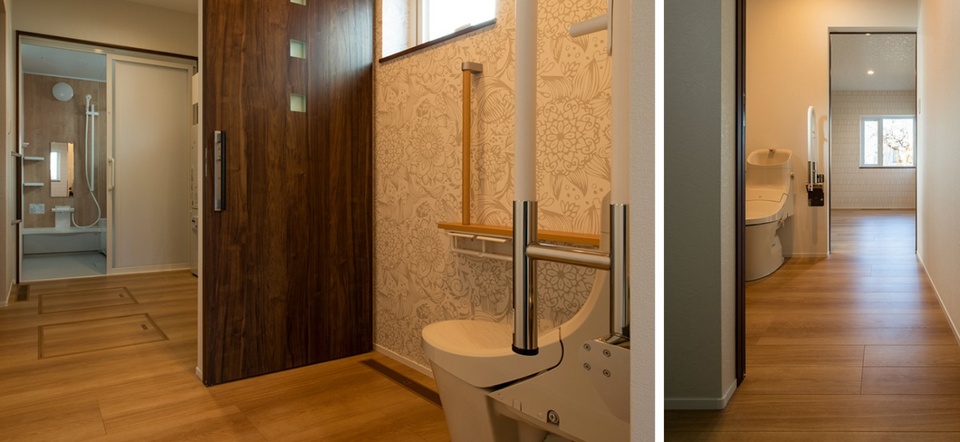 「車イスで暮らす家に必要な要素を、すべて設計に反映しました」と瀧本社長が話すように、回遊動線のほかにも、最大で約130㎝とった開口部、2方向からアクセスできるトイレ・洗面所、玄関や水回りの手すりといった設計に、将来を考えた工夫が見られます。